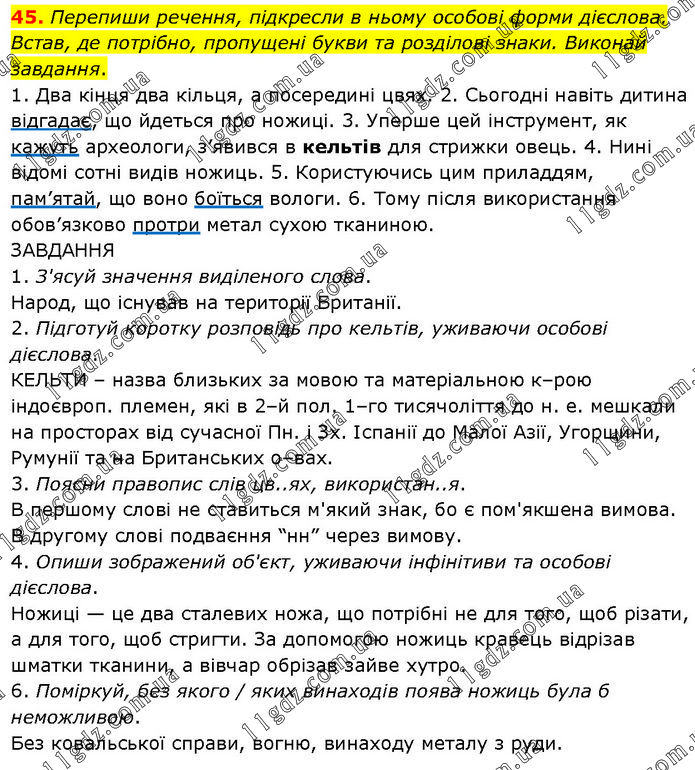 Перепиши речення, підкресли в ньому особові форми дієслова. Встав, де потрібно, пропущені букви та розділові знаки. Виконай завдання. 1. Два кінця два кільця, а посередині цвях. 2. Сьогодні навіть дитина відгадає, що йдеться про ножиці. 3. Уперше цей інструмент, як кажуть археологи, з’явився в кельтів для стрижки овець. 4. Нині відомі сотні видів ножиць. 5. Користуючись цим приладдям, пам’ятай, що воно боїться вологи. 6. Тому після використання обов’язково протри метал сухою тканиною. ЗАВДАННЯ 1. З'ясуй значення виділеного слова. Народ, що існував на території Британії. 2. Підготуй коротку розповідь про кельтів, уживаючи особові дієслова. КЕЛЬТИ – назва близьких за мовою та матеріальною к–рою індоєвроп. племен, які в 2–й пол. 1–го тисячоліття до н. е. мешкали на просторах від сучасної Пн. і Зх. Іспанії до Малої Азії, Угорщини, Румунії та на Британських о–вах. 3. Поясни правопис слів цв..ях, використан..я. В першому слові не ставиться м'який знак, бо є пом'якшена вимова. В другому слові подваєння “нн” через вимову. 4. Опиши зображений об'єкт, уживаючи інфінітиви та особові дієслова. Ножиці — це два сталевих ножа, що потрібні не для того, щоб різати, а для того, щоб стригти. За допомогою ножиць кравець відрізав шматки тканини, а вівчар обрізав зайве хутро. 6. Поміркуй, без якого / яких винаходів поява ножиць була б неможливою. Без ковальської справи, вогню, винаходу металу з руди.