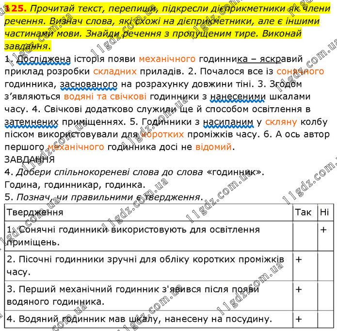 125. Прочитай текст, перепиши, підкресли дієприкметники як члени речення. Визнач слова, які схожі на дієприкметники, але є іншими частинами мови. Знайди речення з пропущеним тире. Виконай завдання. 1. Досліджена історія появи механічного годинника – яскравий приклад розробки складних приладів. 2. Почалося все із сонячного годинника, заснованого на розрахунку довжини тіні. 3. Згодом з’являються водяні та свічкові годинники з нанесеними шкалами часу. 4. Свічкові додатково служили ще й способом освітлення в затемнених приміщеннях. 5. Годинники з насипаним у скляну колбу піском використовували для коротких проміжків часу. 6. А ось автор першого механічного годинника досі не відомий. ЗАВДАННЯ 4. Добери спільнокореневі слова до слова «годинник». Година, годинникар, годинка. 5. Познач, чи правильними є твердження.