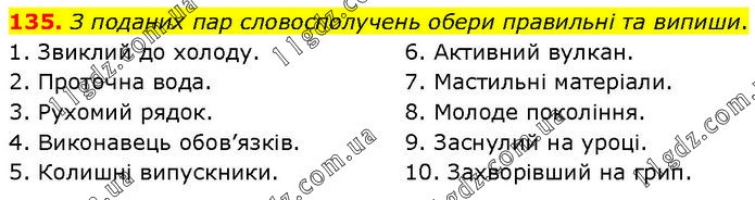 135. З поданих пар словосполучень обери правильні та випиши. 1. Звиклий до холоду. 2. Проточна вода. 3. Рухомий рядок. 4. Виконавець обов’язків. 5. Колишні випускники. 6. Активний вулкан. 7. Мастильні матеріали. 8. Молоде покоління. 9. Заснулий на уроці. 10. Захворівший на грип.