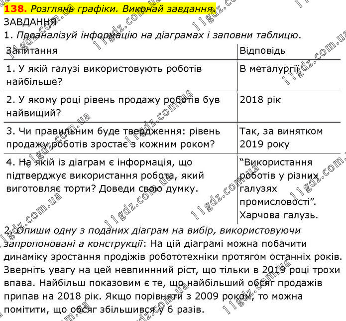 138. Розглянь графіки. Виконай завдання. ЗАВДАННЯ 1. Проаналізуй інформацію на діаграмах і заповни таблицю. Запитання Відповідь 1. У якій галузі використовують роботів найбільше? В металургії 2. У якому році рівень продажу роботів був найвищий? 2018 рік 3. Чи правильним буде твердження: рівень продажу роботів зростає з кожним роком? Так, за винятком 2019 року 4. На якій із діаграм є інформація, що підтверджує використання робота, який виготовляє торти? Доведи свою думку. “Використання роботів у різних галузях промисловості”. Харчова галузь. 2. Опиши одну з поданих діаграм на вибір, використовуючи запропоновані а конструкції: На цій діаграмі можна побачити динаміку зростання продіжів робототехніки протягом останніх років. Зверніть увагу на цей невпиннний ріст, що тільки в 2019 році трохи впава. Найбільш показовим є те, що найбільший обсяг продажів припав на 2018 рік. Якщо порівняти з 2009 роком, то можна помітити, що обсяг збільшився у 6 разів.