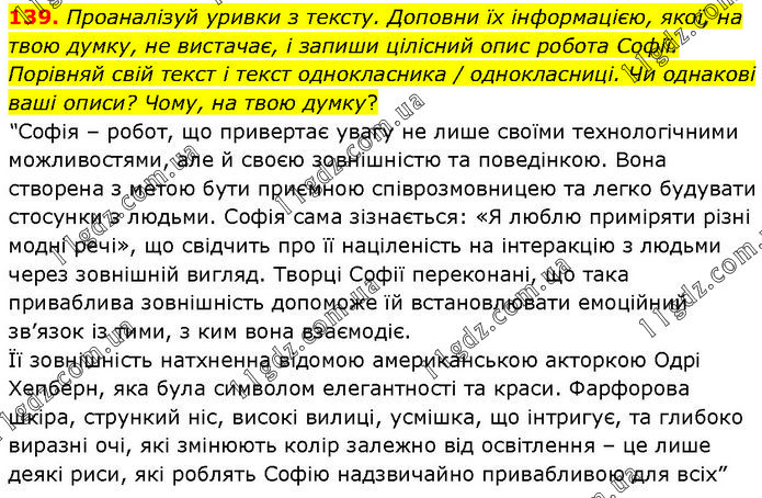 139. Проаналізуй уривки з тексту. Доповни їх інформацією, якої, на твою думку, не вистачає, і запиши цілісний опис робота Софії. Порівняй свій текст і текст однокласника / однокласниці. Чи однакові ваші описи? Чому, на твою думку? “Софія – робот, що привертає увагу не лише своїми технологічними можливостями, але й своєю зовнішністю та поведінкою. Вона створена з метою бути приємною співрозмовницею та легко будувати стосунки з людьми. Софія сама зізнається: «Я люблю приміряти різні модні речі», що свідчить про її націленість на інтеракцію з людьми через зовнішній вигляд. Творці Софії переконані, що така приваблива зовнішність допоможе їй встановлювати емоційний зв’язок із тими, з ким вона взаємодіє. Її зовнішність натхненна відомою американською акторкою Одрі Хепберн, яка була символом елегантності та краси. Фарфорова шкіра, стрункий ніс, високі вилиці, усмішка, що інтригує, та глибоко виразні очі, які змінюють колір залежно від освітлення – це лише деякі риси, які роблять Софію надзвичайно привабливою для всіх”