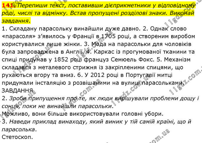 141. Перепиши текст, поставивши дієприкметники у відповідному роді, числі та відмінку. Встав пропущені розділові знаки. Виконай завдання. 1. Складану парасольку винайшли дуже давно. 2. Однак слово «парасоля» з’явилось у Франції в 1705 році, а створеним виробом користувалися лише жінки. 3. Мода на парасольки для чоловіків була запроваджена в Англії. 4. Каркас із прогумованої тканини та спиці придумав у 1852 році француз Семюель Фокс. 5. Механізм складався з металевого стрижня із закріпленими спицями, що рухаються вгору та вниз. 6. У 2012 році в Португалії митці придумали інсталяцію з розвішаними на вулиці парасольками. ЗАВДАННЯ 2. Зроби припущення про те, як люди вирішували проблеми дощу і сонця, поки не винайшли парасольки. Можливо, вони більше використовували головні убори. 3. Наведи приклад винаходу, який виник у тій самій країні, що й парасолька. Стетоскоп.