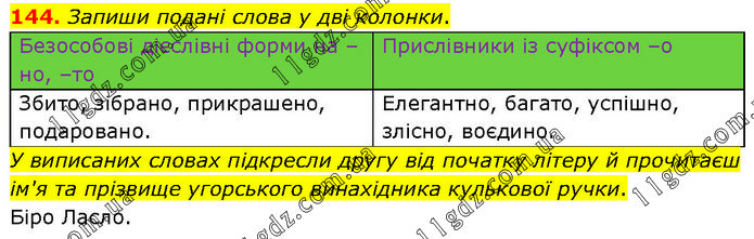 144. Запиши подані слова у дві колонки. Безособові дієслівні форми на –но, –то Прислівники із суфіксом –о Збито, зібрано, прикрашено, подаровано. Елегантно, багато, успішно, злісно, воєдино. У виписаних словах підкресли другу від початку літеру й прочитаєш ім'я та прізвище угорського винахідника кулькової ручки. Біро Ласло.