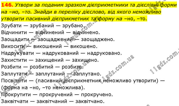 146. Утвори за поданим зразком дієприкметники та дієслівні форми на –но, –то. Знайди в переліку дієслово, від якого неможливо утворити пасивний дієприкметник та форму на –но, –то. Зрубати — зрубаний — зрубано. Відчинити — відчинений — відчинено. Заощадити — заощаджений — заощаджено. Викосити — викошений — викошено. Надрукувати — надрукований — надруковано. Захистити — захищений — захищено. Розбити — розбитий — розбито. Заплутати — заплутаний — заплутано. Посвітліти — (пасивний дієприкметник неможливо утворити) — (форма на –но, –то неможлива). Прокрутити — прокручений — прокручено. Заквітчати — заквітчаний — заквітчано.