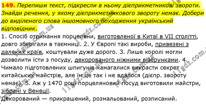 149. Перепиши текст, підкресли в ньому дієприкметникові звороти. Знайди речення, у якому дієприкметникового звороту немає. Добери до виділеного слова іншомовного походження український відповідник. 1. Спосіб отримання порцеляни, виготовленої в Китаї в VII столітті, довго зберігали в таємниці. 2. У Європі такі вироби, привезені з далеких країв, коштували дуже дорого. 3. Лише королі могли дозволити їсти з посуду, декорованого ніжними візерунками. 4. Чимало підготовлених шпигунів намагалися викрасти секрет китайських майстрів, але їм це так і не вдалося (дієпр. звороту немає). 5. Аж у 1470 році порцеляновий посуд виготовили майстри, зібрані у Венеції. Декорований — прикрашений, розмальований, розписаний.