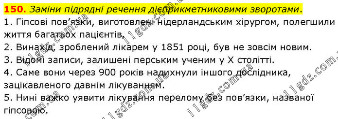 150. Заміни підрядні речення дієприкметниковими зворотами. 1. Гіпсові пов’язки, виготовлені нідерландським хірургом, полегшили життя багатьох пацієнтів. 2. Винахід, зроблений лікарем у 1851 році, був не зовсім новим. 3. Відомі записи, залишені перським ученим у Х столітті. 4. Саме вони через 900 років надихнули іншого дослідника, зацікавленого давнім лікуванням. 5. Нині важко уявити лікування перелому без пов’язки, названої гіпсовою.