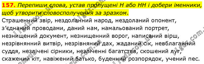 157. Перепиши слова, устав пропущені Н або НН і добери іменники, щоб утворити словосполучення за зразком. Страшенний звір, нездоланний народ, нездоланий опонент, з’єднаний проводами, даний нам, намальований портрет, незнищений документ, незнищенний ворог, написаний вірш, незрівнянний витвір, незрівняний дах, жаданий сік, невблаганний суддя, незлічені сірники, незліченні багатства, скошений луг, скажений кіт, навіжений батько, буденний розпорядок, учений пес.
