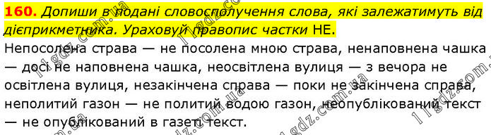 160. Допиши в подані словосполучення слова, які залежатимуть від дієприкметника. Ураховуй правопис частки НЕ. Непосолена страва — не посолена мною страва, ненаповнена чашка — досі не наповнена чашка, неосвітлена вулиця — з вечора не освітлена вулиця, незакінчена справа — поки не закінчена справа, неполитий газон — не политий водою газон, неопублікований текст — не опублікований в газеті текст.