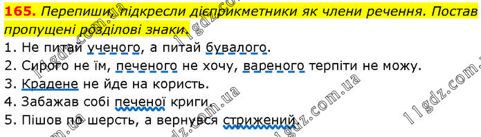 165. Перепиши, підкресли дієприкметники як члени речення. Постав пропущені розділові знаки. 1. Не питай ученого, а питай бувалого. 2. Сирого не їм, печеного не хочу, вареного терпіти не можу. 3. Крадене не йде на користь. 4. Забажав собі печеної криги. 5. Пішов по шерсть, а вернувся стрижений.