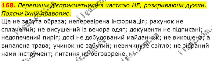 168. Перепиши дієприкметники з часткою НЕ, розкриваючи дужки. Поясни їхній правопис. Ще не забута образа; неперевірена інформація; рахунок не сплачений; не висушений із вечора одяг; документи не підписані; недопечений пиріг; досі не добудований майданчик; не викошена, а випалена трава; учинок не забутий; невимкнуте світло; не зібраний нами інструмент; питання не обговорене.
