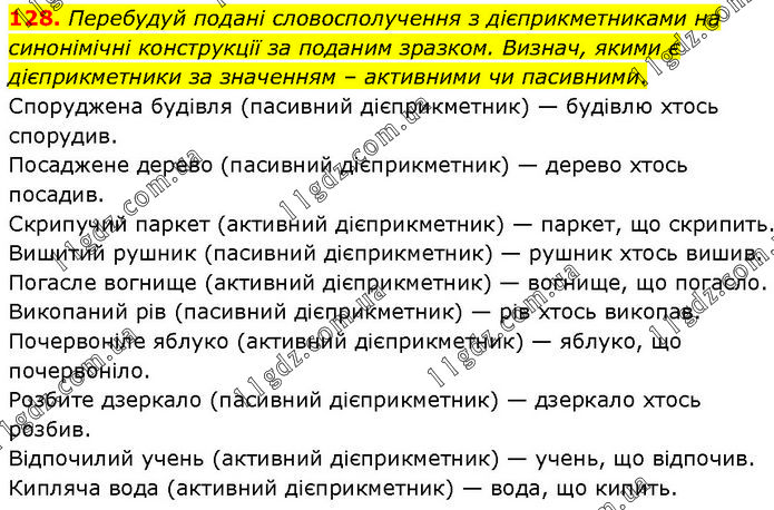 128. Перебудуй подані словосполучення з дієприкметниками на синонімічні конструкції за поданим зразком. Визнач, якими є дієприкметники за значенням – активними чи пасивними. Споруджена будівля (пасивний дієприкметник) — будівлю хтось спорудив. Посаджене дерево (пасивний дієприкметник) — дерево хтось посадив. Скрипучий паркет (активний дієприкметник) — паркет, що скрипить. Вишитий рушник (пасивний дієприкметник) — рушник хтось вишив. Погасле вогнище (активний дієприкметник) — вогнище, що погасло. Викопаний рів (пасивний дієприкметник) — рів хтось викопав. Почервоніле яблуко (активний дієприкметник) — яблуко, що почервоніло. Розбите дзеркало (пасивний дієприкметник) — дзеркало хтось розбив. Відпочилий учень (активний дієприкметник) — учень, що відпочив. Кипляча вода (активний дієприкметник) — вода, що кипить.
