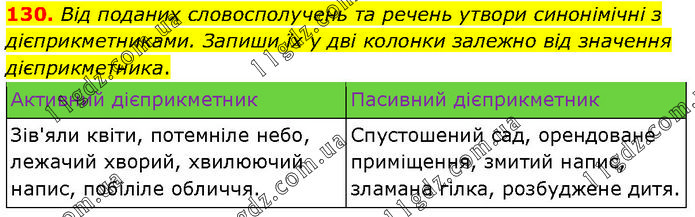 130. Від поданих словосполучень та речень утвори синонімічні з дієприкметниками. Запиши їх у дві колонки залежно від значення дієприкметника. Активний дієприкметник Пасивний дієприкметник Зів'яли квіти, потемніле небо, лежачий хворий, хвилюючий напис, побіліле обличчя. Спустошений сад, орендоване приміщення, змитий напис, зламана гілка, розбуджене дитя.