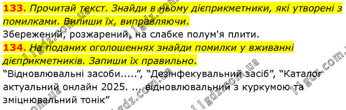 133. Прочитай текст. Знайди в ньому дієприкметники, які утворені з помилками. Випиши їх, виправляючи. Збережений, розжарений, на слабке полум'я плити. 134. На поданих оголошеннях знайди помилки у вживанні дієприкметників. Запиши їх правильно. “Відновлювальні засоби.....”, “Дезінфекувальний засіб”, “Каталог актуальний онлайн 2025. ... відновлювальний з куркумою та зміцнювальний тонік”