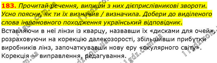 183. Прочитай речення, випиши з них дієприслівникові звороти. Усно поясни, як ти їх визначив / визначила. Добери до виділеного слова іншомовного походження український відповідник. Вставляючи в неї лінзи із кварцу, назвавши їх «дисками для очей», розраховуючи на корекцію далекозорості, збільшивши прибутки виробників лінз, започаткувавши нову еру «окулярного світу». Корекція — виправлення, редагування.