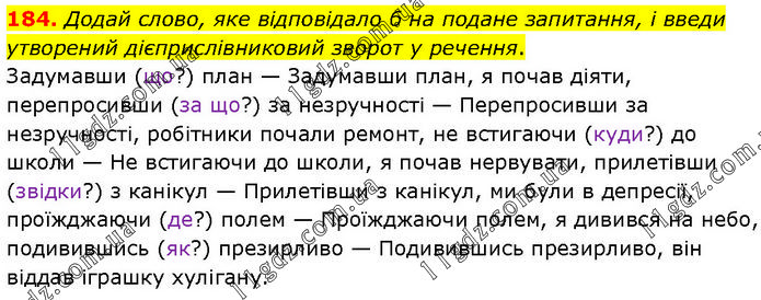184. Додай слово, яке відповідало б на подане запитання, і введи утворений дієприслівниковий зворот у речення. Задумавши (що?) план — Задумавши план, я почав діяти, перепросивши (за що?) за незручності — Перепросивши за незручності, робітники почали ремонт, не встигаючи (куди?) до школи — Не встигаючи до школи, я почав нервувати, прилетівши (звідки?) з канікул — Прилетівши з канікул, ми були в депресії, проїжджаючи (де?) полем — Проїжджаючи полем, я дивився на небо, подивившись (як?) презирливо — Подивившись презирливо, він віддав іграшку хулігану.