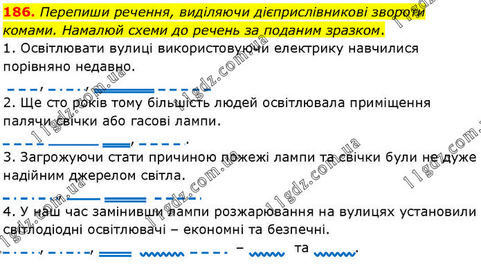 186. Перепиши речення, виділяючи дієприслівникові звороти комами. Намалюй схеми до речень за поданим зразком. 1. Освітлювати вулиці використовуючи електрику навчилися порівняно недавно. , , 2. Ще сто років тому більшість людей освітлювала приміщення палячи свічки або гасові лампи. ______ , . 3. Загрожуючи стати причиною пожежі лампи та свічки були не дуже надійним джерелом світла. , ____ 4. У наш час замінивши лампи розжарювання на вулицях установили світлодіодні освітлювачі – економні та безпечні. , , – та .