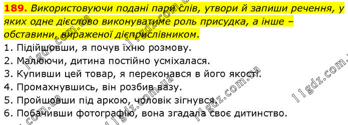 189. Використовуючи подані пари слів, утвори й запиши речення, у яких одне дієслово виконуватиме роль присудка, а інше – обставини, вираженої дієприслівником. 1. Підійшовши, я почув їхню розмову. 2. Малюючи, дитина постійно усміхалася. 3. Купивши цей товар, я переконався в його якості. 4. Промахнувшись, він розбив вазу. 5. Пройшовши під аркою, чоловік зігнувся. 6. Побачивши фотографію, вона згадала своє дитинство.