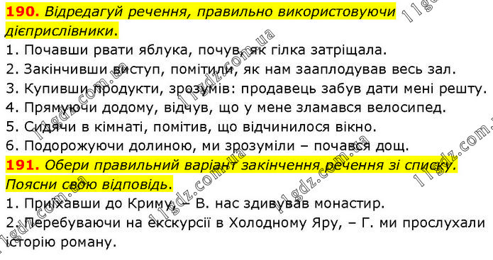 190. Відредагуй речення, правильно використовуючи дієприслівники. 1. Почавши рвати яблука, почув, як гілка затріщала. 2. Закінчивши виступ, помітили, як нам зааплодував весь зал. 3. Купивши продукти, зрозумів: продавець забув дати мені решту. 4. Прямуючи додому, відчув, що у мене зламався велосипед. 5. Сидячи в кімнаті, помітив, що відчинилося вікно. 6. Подорожуючи долиною, ми зрозуміли – почався дощ. 191. Обери правильний варіант закінчення речення зі списку. Поясни свою відповідь. 1. Приїхавши до Криму, – В. нас здивував монастир. 2. Перебуваючи на екскурсії в Холодному Яру, – Г. ми прослухали історію роману.