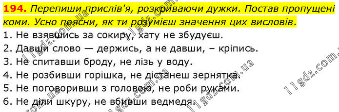 194. Перепиши прислів'я, розкриваючи дужки. Постав пропущені коми. Усно поясни, як ти розумієш значення цих висловів. 1. Не взявшись за сокиру, хату не збудуєш. 2. Давши слово — держись, а не давши, – кріпись. 3. Не спитавши броду, не лізь у воду. 4. Не розбивши горішка, не дістанеш зернятка. 5. Не поговоривши з головою, не роби руками. 6. Не діли шкуру, не вбивши ведмедя.