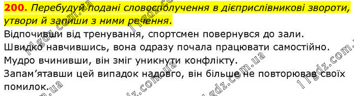 200. Перебудуй подані словосполучення в дієприслівникові звороти, утвори й запиши з ними речення. Відпочивши від тренування, спортсмен повернувся до зали. Швидко навчившись, вона одразу почала працювати самостійно. Мудро вчинивши, він зміг уникнути конфлікту. Запам’ятавши цей випадок надовго, він більше не повторював своїх помилок.