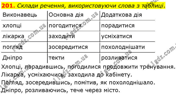 201. Склади речення, використовуючи слова з таблиці. Виконавець Основна дія Додаткова дія хлопці погодитися порадитися лікарка заходити усміхатися погляд зосередитися похолоднішати Дніпро текти розливатися Хлопці, порадившись, погодилися продовжити тренування. Лікарка, усміхаючись, заходила до кабінету. Погляд, зосередившись, помітив, як похолоднішало. Дніпро, розливаючись, тече через місто.