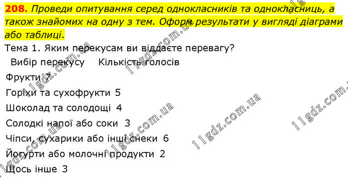 208. Проведи опитування серед однокласників та однокласниць, а також знайомих на одну з тем. Оформ результати у вигляді діаграми або таблиці. Тема 1. Яким перекусам ви віддаєте перевагу? Вибір перекусу Кількість голосів Фрукти 7 Горіхи та сухофрукти 5 Шоколад та солодощі 4 Солодкі напої або соки 3 Чіпси, сухарики або інші снеки 6 Йогурти або молочні продукти 2 Щось інше 3