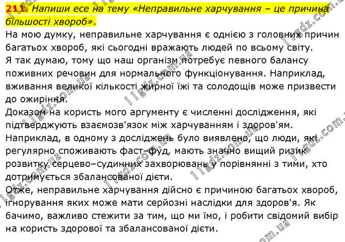 211. Напиши есе на тему «Неправильне харчування – це причина більшості хвороб». На мою думку, неправильне харчування є однією з головних причин багатьох хвороб, які сьогодні вражають людей по всьому світу. Я так думаю, тому що наш організм потребує певного балансу поживних речовин для нормального функціонування. Наприклад, вживання великої кількості жирної їжі та солодощів може призвести до ожиріння. Доказом на користь мого аргументу є численні дослідження, які підтверджують взаємозв'язок між харчуванням і здоров'ям. Наприклад, в одному з досліджень було виявлено, що люди, які регулярно споживають фаст–фуд, мають значно вищий ризик розвитку серцево–судинних захворювань у порівнянні з тими, хто дотримується збалансованої дієти. Отже, неправильне харчування дійсно є причиною багатьох хвороб, ігнорування яких може мати серйозні наслідки для здоров'я. Як бачимо, важливо стежити за тим, що ми їмо, і робити свідомий вибір на користь здорової та збалансованої дієти.