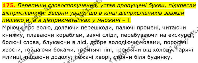 175. Перепиши словосполучення, устав пропущені букви, підкресли дієприслівники. Зверни увагу, що в кінці дієприслівників завжди пишемо и, а в дієприкметниках у множині – і. Мріючи про волю, долаючи перешкоди, палючі промені, читаючи книжку, плаваючи кораблем, заячі сліди, перебуваючи на екскурсії, болючі слова, блукаючи в лісі, добре володіючи мовами, поросячі хвости, гойдаючи боками, тремтячі тіні, тремтячи від холоду, гарячі млинці, падаючи додолу, лежачі хворі, стоячи біля будинку.