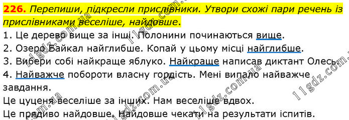 Перепиши, підкресли прислівники. Утвори схожі пари речень із прислівниками веселіше, найдовше. 1. Це дерево вище за інші. Полонини починаються вище. 2. Озеро Байкал найглибше. Копай у цьому місці найглибше. 3. Вибери собі найкраще яблуко. Найкраще написав диктант Олесь. 4. Найважче побороти власну гордість. Мені випало найважче завдання. Це цуценя веселіше за інших. Нам веселіше вдвох. Це прядиво найдовше. Найдовше чекати на результати іспитів.