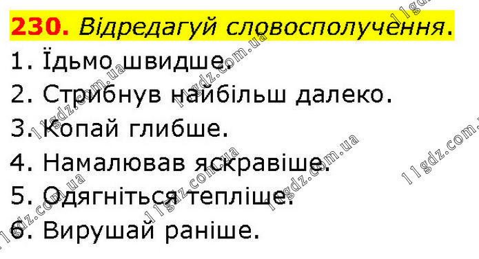 Відредагуй словосполучення. 1. Їдьмо швидше. 2. Стрибнув найбільш далеко. 3. Копай глибше. 4. Намалював яскравіше. 5. Одягніться тепліше. 6. Вирушай раніше.