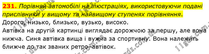 Порівняй автомобілі на ілюстраціях, використовуючи подані прислівники у вищому та найвищому ступенях порівняння. Дорого, низько, близько, вузько, високо. Автівка на другій картинці виглядає дорожчою за першу, але вона нижча. Синя автівка вища і вужча за спортивну. Вона належить ближче до так званих ретро–автівок.