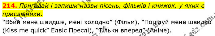 Пригадай і запиши назви пісень, фільмів і книжок, у яких є прислівники. “Вбий мене швидше, мені холодно” (Фільм), “Поцілуй мене швидко (Kiss me quick” Елвіс Преслі), “Тільки вперед” (Аніме).