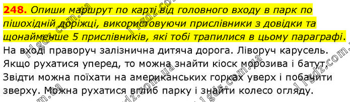 Опиши маршрут по карті від головного входу в парк по пішохідній доріжці, використовуючи прислівники з довідки та щонайменше 5 прислівників, які тобі трапилися в цьому параграфі. На вході праворуч залізнична дитяча дорога. Ліворуч карусель. Якщо рухатися уперед, то можна знайти кіоск морозива і батут. Звідти можна поїхати на американських горках уверх і побачити зверху. Можна рухатися вглиб парку і знайти колесо огляду.