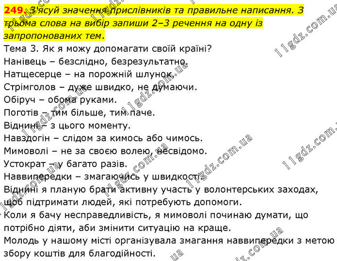 З'ясуй значення прислівників та правильне написання. З трьома слова на вибір запиши 2–3 речення на одну із запропонованих тем. Тема 3. Як я можу допомагати своїй країні? Нанівець – безслідно, безрезультатно. Натщесерце – на порожній шлунок. Стрімголов – дуже швидко, не думаючи. Обіруч – обома руками. Поготів – тим більше, тим паче. Віднині – з цього моменту. Навздогін – слідом за кимось або чимось. Мимоволі – не за своєю волею, несвідомо. Устократ – у багато разів. Наввипередки – змагаючись у швидкості. Віднині я планую брати активну участь у волонтерських заходах, щоб підтримати людей, які потребують допомоги. Коли я бачу несправедливість, я мимоволі починаю думати, що потрібно діяти, аби змінити ситуацію на краще. Молодь у нашому місті організувала змагання наввипередки з метою збору коштів для благодійності.