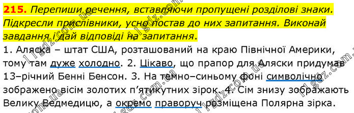 Перепиши речення, вставляючи пропущені розділові знаки. Підкресли прислівники, усно постав до них запитання. Виконай завдання і дай відповіді на запитання. 1. Аляска – штат США, розташований на краю Північної Америки, тому там дуже холодно. 2. Цікаво, що прапор для Аляски придумав 13–річний Бенні Бенсон. 3. На темно–синьому фоні символічно зображено вісім золотих п’ятикутних зірок. 4. Сім знизу зображають Велику Ведмедицю, а окремо праворуч розміщена Полярна зірка.