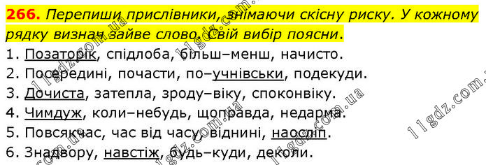 Перепиши прислівники, знімаючи скісну риску. У кожному рядку визнач зайве слово. Свій вибір поясни. 1. Позаторік, спідлоба, більш–менш, начисто. 2. Посередині, почасти, по–учнівськи, подекуди. 3. Дочиста, затепла, зроду–віку, споконвіку. 4. Чимдуж, коли–небудь, щоправда, недарма. 5. Повсякчас, час від часу, віднині, наосліп. 6. Знадвору, навстіж, будь–куди, деколи.