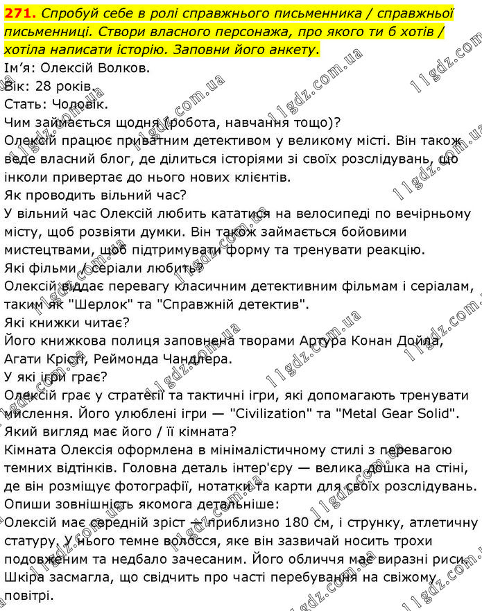 Спробуй себе в ролі справжнього письменника / справжньої письменниці. Створи власного персонажа, про якого ти б хотів / хотіла написати історію. Заповни його анкету. Ім’я: Олексій Волков. Вік: 28 років. Стать: Чоловік. Чим займається щодня (робота, навчання тощо)? Олексій працює приватним детективом у великому місті. Він також веде власний блог, де ділиться історіями зі своїх розслідувань, що інколи привертає до нього нових клієнтів. Як проводить вільний час? У вільний час Олексій любить кататися на велосипеді по вечірньому місту, щоб розвіяти думки. Він також займається бойовими мистецтвами, щоб підтримувати форму та тренувати реакцію. Які фільми / серіали любить? Олексій віддає перевагу класичним детективним фільмам і серіалам, таким як "Шерлок" та "Справжній детектив". Які книжки читає? Його книжкова полиця заповнена творами Артура Конан Дойла, Агати Крісті, Реймонда Чандлера. У які ігри грає? Олексій грає у стратегії та тактичні ігри, які допомагають тренувати мислення. Його улюблені ігри — "Civilization" та "Metal Gear Solid". Який вигляд має його / її кімната? Кімната Олексія оформлена в мінімалістичному стилі з перевагою темних відтінків. Головна деталь інтер'єру — велика дошка на стіні, де він розміщує фотографії, нотатки та карти для своїх розслідувань. Опиши зовнішність якомога детальніше: Олексій має середній зріст — приблизно 180 см, і струнку, атлетичну статуру. У нього темне волосся, яке він зазвичай носить трохи подовженим та недбало зачесаним. Його обличчя має виразні риси. Шкіра засмагла, що свідчить про часті перебування на свіжому повітрі.