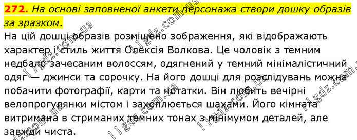 На основі заповненої анкети персонажа створи дошку образів за зразком. На цій дошці образів розміщено зображення, які відображають характер і стиль життя Олексія Волкова. Це чоловік з темним недбало зачесаним волоссям, одягнений у темний мінімалістичний одяг — джинси та сорочку. На його дошці для розслідувань можна побачити фотографії, карти та нотатки. Він любить вечірні велопрогулянки містом і захоплюється шахами. Його кімната витримана в стриманих темних тонах з мінімумом деталей, але завжди чиста.