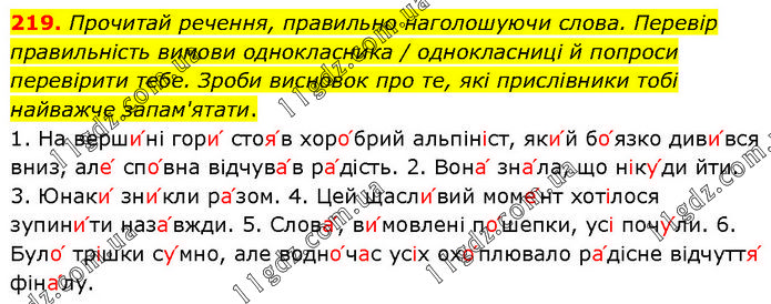 Прочитай речення, правильно наголошуючи слова. Перевір правильність вимови однокласника / однокласниці й попроси перевірити тебе. Зроби висновок про те, які прислівники тобі найважче запам'ятати. 1. На верши՛ні гори՛ стоя՛в хоро՛брий альпініст, яки՛й бо՛язко диви՛вся вниз, але՛ спо՛вна відчува՛в ра՛дість. 2. Вона՛ зна՛ла, що ніку՛ди йти. 3. Юнаки՛ зни՛кли ра՛зом. 4. Цей щасли՛вий моме՛нт хотілося зупини՛ти наза՛вжди. 5. Слова՛, ви՛мовлені по՛шепки, усі почу՛ли. 6. Було՛ трішки су՛мно, але водно՛час усіх охо՛плювало ра՛дісне відчуття՛ фіна՛лу.