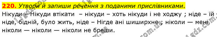 Утвори й запиши речення з поданими прислівниками. Нікуди – Нікуди втікати – нікуди – хоть нікуди і не ходжу ; ніде – їй ніде, бідній, було жить, ніде – Нігде ані шиширхне; ніколи — мені ніколи — ніколи — ніколи не бреши