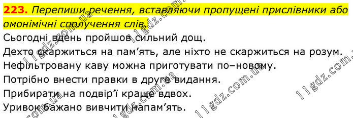 Перепиши речення, вставляючи пропущені прислівники або омонімічні сполучення слів. Сьогодні вдень пройшов сильний дощ. Дехто скаржиться на пам’ять, але ніхто не скаржиться на розум. Нефільтровану каву можна приготувати по–новому. Потрібно внести правки в друге видання. Прибирати на подвір’ї краще вдвох. Уривок бажано вивчити напам’ять.
