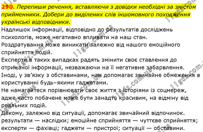 Перепиши речення, вставляючи з довідки необхідні за змістом прийменники. Добери до виділених слів іншомовного походження українські відповідники. Надлишок інформації, відповідно до результатів досліджень психологів, може негативно впливати на наш стан. Роздратування може виникати залежно від нашого емоційного сприйняття подій. Експерти в таких випадках радять змінити своє ставлення до отриманої інформації, незважаючи на її негативне забарвлення. Іноді, у зв’язку з обставинами, нам допомагає звичайне обмеження в користуванні будь–якими гаджетами. Не намагайтеся порівнювати своє життя з історіями із соцмереж, адже часто побачене може бути занадто красивим, на відміну від реальних подій. Декому, залежно від ситуації, допомагає звичайний відпочинок. результати — наслідки; емоційне сприйняття — чуттєве сприйняття; експерти — фахівці; гаджети — пристрої; ситуації — обставини.