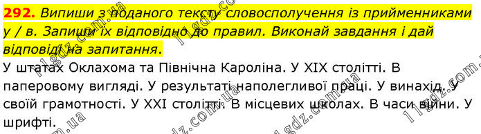 Випиши з поданого тексту словосполучення із прийменниками у / в. Запиши їх відповідно до правил. Виконай завдання і дай відповіді на запитання. У штатах Оклахома та Північна Кароліна. У ХІХ столітті. В паперовому вигляді. У результаті наполегливої праці. У винахід. У своїй грамотності. У ХХІ столітті. В місцевих школах. В часи війни. У шрифті.