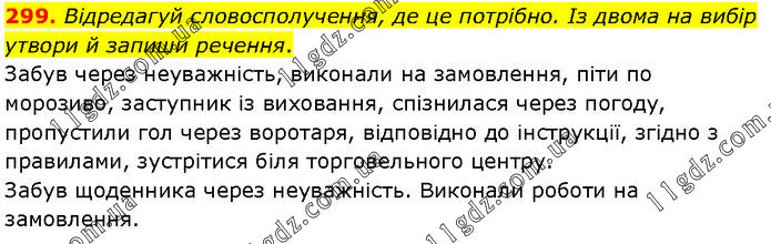 Відредагуй словосполучення, де це потрібно. Із двома на вибір утвори й запиши речення. Забув через неуважність, виконали на замовлення, піти по морозиво, заступник із виховання, спізнилася через погоду, пропустили гол через воротаря, відповідно до інструкції, згідно з правилами, зустрітися біля торговельного центру. Забув щоденника через неуважність. Виконали роботи на замовлення.