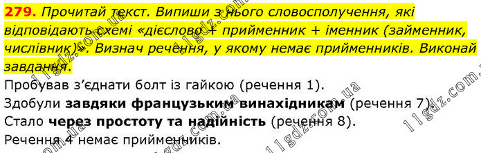 Прочитай текст. Випиши з нього словосполучення, які відповідають схемі «дієслово + прийменник + іменник (займенник, числівник)». Визнач речення, у якому немає прийменників. Виконай завдання. Пробував з’єднати болт із гайкою (речення 1). Здобули завдяки французьким винахідникам (речення 7). Стало через простоту та надійність (речення 8). Речення 4 немає прийменників.