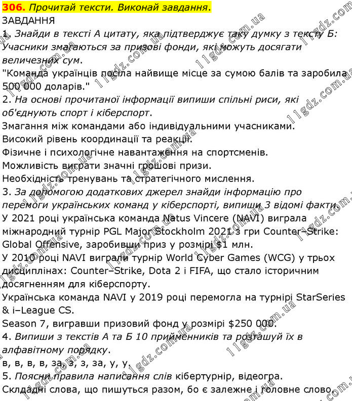Прочитай тексти. Виконай завдання. ЗАВДАННЯ 1. Знайди в тексті А цитату, яка підтверджує таку думку з тексту Б: Учасники змагаються за призові фонди, які можуть досягати величезних сум. "Команда українців посіла найвище місце за сумою балів та заробила 500 000 доларів." 2. На основі прочитаної інформації випиши спільні риси, які об'єднують спорт і кіберспорт. Змагання між командами або індивідуальними учасниками. Високий рівень координації та реакції. Фізичне і психологічне навантаження на спортсменів. Можливість виграти значні грошові призи. Необхідність тренувань та стратегічного мислення. 3. За допомогою додаткових джерел знайди інформацію про перемоги українських команд у кіберспорті, випиши 3 відомі факти. У 2021 році українська команда Natus Vincere (NAVI) виграла міжнародний турнір PGL Major Stockholm 2021 з гри Counter–Strike: Global Offensive, заробивши приз у розмірі $1 млн. У 2010 році NAVI виграли турнір World Cyber Games (WCG) у трьох дисциплінах: Counter–Strike, Dota 2 і FIFA, що стало історичним досягненням для кіберспорту. Українська команда NAVI у 2019 році перемогла на турнірі StarSeries & i–League CS. Season 7, вигравши призовий фонд у розмірі $250 000. 4. Випиши з текстів А та Б 10 прийменників та розташуй їх в алфавітному порядку. в, в, в, в, за, з, з, за, у, у. 5. Поясни правила написання слів кібертурнір, відеогра. Склдадні слова, що пишуться разом, бо є залежне і головне слово.