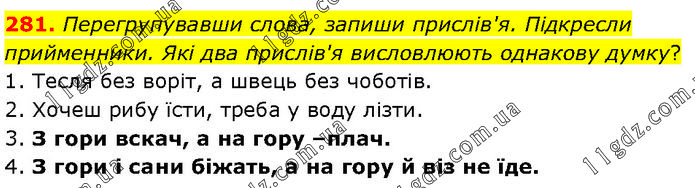 Перегрупувавши слова, запиши прислів'я. Підкресли прийменники. Які два прислів'я висловлюють однакову думку? 1. Тесля без воріт, а швець без чоботів. 2. Хочеш рибу їсти, треба у воду лізти. 3. З гори вскач, а на гору – плач. 4. З гори і сани біжать, а на гору й віз не їде.