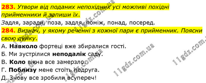 283. Утвори від поданих непохідних усі можливі похідні прийменники й запиши їх. Задля, заради, поза, задля, поміж, понад, посеред. 284. Визнач, у якому реченні з кожної пари є прийменник. Поясни свою думку. А. Навколо фортеці вже збиралися гості. Б. Ми зустрілися неподалік саду. В. Коло вікна все замерзло. Г. Поблизу мене стоїть подруга. Д. Знову все зробили всупереч!