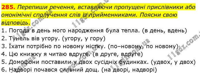 Перепиши речення, вставляючи пропущені прислівники або омонімічні сполучення слів із прийменниками. Поясни свою відповідь. 1. Погода в день мого народження була тепла. (в день, вдень) 2. Тунель вів угору. (угору, у гору) 3. Їхати потрібно по новому містку. (по–новому, по новому) 4. Цю книжку я читаю вдруге. (в друге, вдруге) 5. Домофони поставили у двох сусідніх будинках. (удвох, у двох) 6. Надворі почався сильний дощ. (на дворі, надворі)