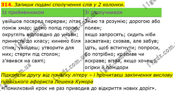 314. Запиши подані сполучення слів у 2 колонки. Із прийменником Зі сполучником увійшов посеред перерви; літає поміж хмар; ідемо попід горою; округліть відповідно до умови; принести до класу; кинемо біля стіни; увійдеш; утворити для них; стерти під столом; з’явився на святі; Знаю та розумію; дорогою або полем; якщо запросять; сидить ніби засватана; сховав, але забув; ідіть, щоб встигнути; попроси, бо потрібно; красиве чи яскраве; вітай, якщо хочеш; огірки й помідори Підкресли другу від початку літеру – і прочитаєш закінчення вислову польського афориста Лешека Кумора «Помилковий крок не раз приводив до відкриття нових доріг».